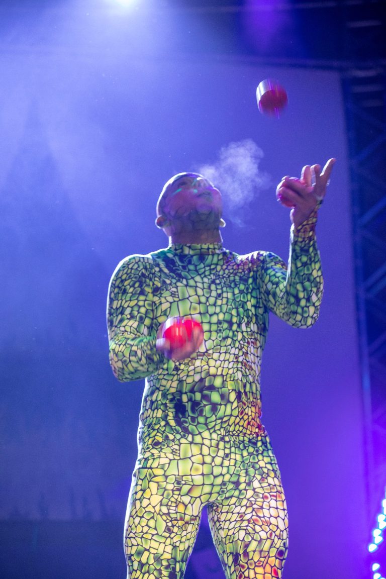 HENGE is a Neolithic celebration of life where sacred stones have meaning and purpose. The Preseli Bluestones represent the permanence & eternity of ancestry and locations were chosen carefully in relation to the sun. These dolmen structures can be found across Wales and through this unique and colorful display our guests can be a part of the rich heritage, spellbinding mystery & the endless possibilities of these magical stones. Split-second timing and thrilling feats, colliding dance and circus pushing the limits of both art forms. Oversized blue stones are deconstructed and reformed into an infinite variety of shapes for the performers to play on, move with and explore. Our guests were encouraged to stay and play afterwards as the rocks become a gateway for climbing and sliding.